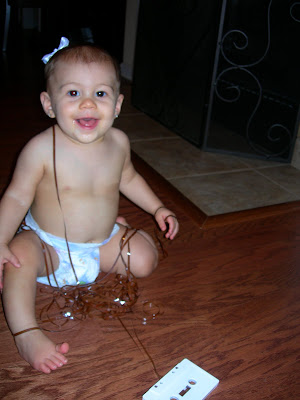 So, every child has a time when it is his or her first time to do something mischievious. I was in the kitchen cleaning up and knew Claire was plundering in the entertainment center. She became quiet, so, that's when I knew I needed to investigate what exactly she was plundering. Turns out-she was pulling all of the tape out of a cassette ... and having a blast! Luckily, the tape wasn't too important. It was from a Christmas program our church had a few years back.